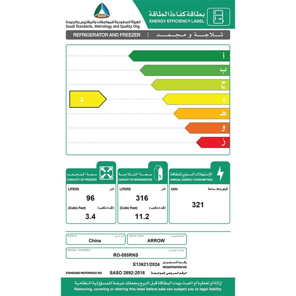 ثلاجة ARROW RO-585RNS، ذات البابين، بسعة 412 لترًا، وسعة تخزين 14.6 قدم.